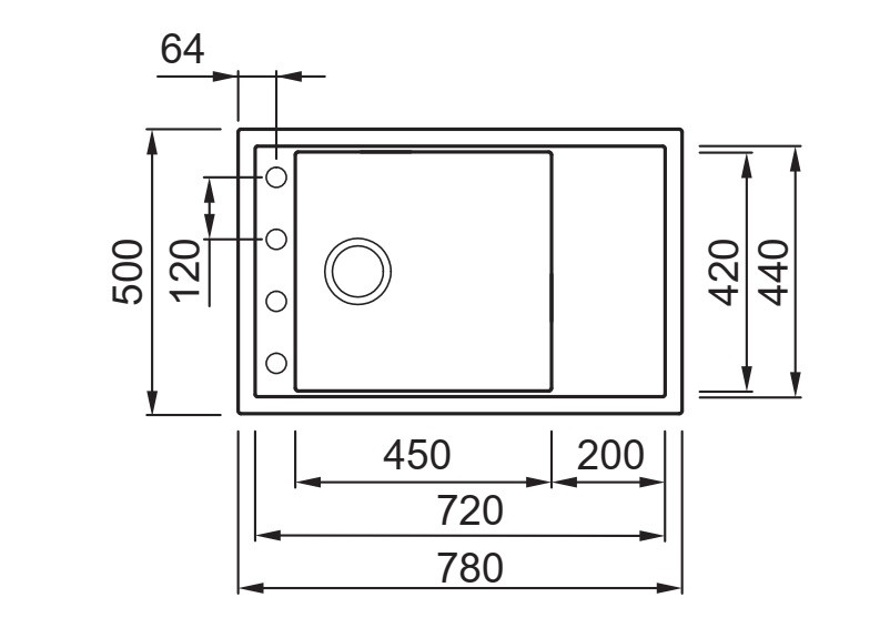 Integrovaná oblast pro příslušenství v odkapávači, vybavená předvrtanými otvory, které vám umožňují instalovat doplňky: excentrické ovládání odpadu, dřezovou baterii s vytahovací sprchou a dávkovač saponátu.
