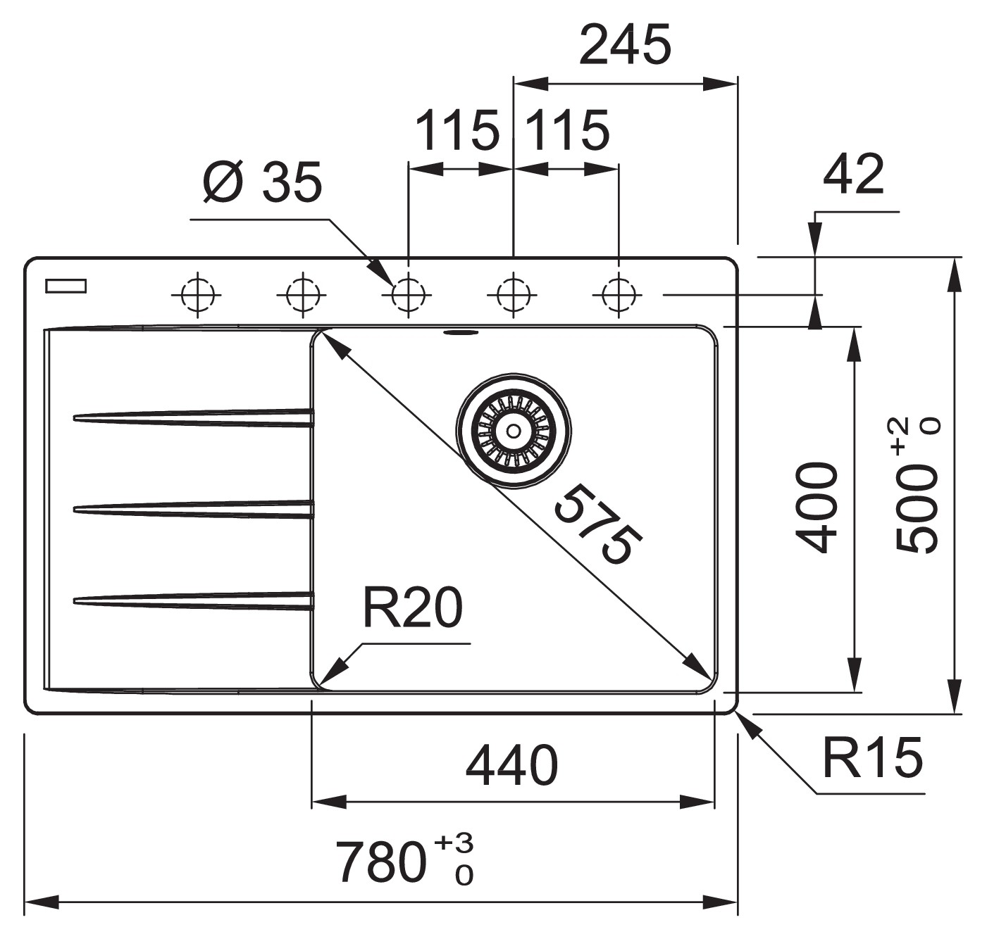 • Rozměr dřezu: 780 x 500 mm