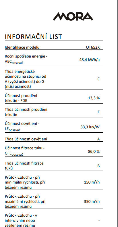 Vestavný výsuvný odsavač par MORA OT 652 X v nerezovém provedení s výkonem 350 m3/h spolehlivě odstraní z kuchyně všechny nežádoucí pachy. Díky posuvnému čelu odsavač dokonale splyne s kuchyňskou linkou, protože motor s horním odtahem je skrytý uvnitř skříňky. Odsavač má tlačítkové 3 rychlostní ovládání umístěné pod lištou a LED osvětlení s výkonem 2,1 W, které perfektně osvítí varnou plochu a vy tak budete dokonale vidět do hrnců či pánví na připravovaný pokrm. Je opatřen omyvatelnými hliníkovými filtry proti mastnotě s polyuretanovou pěnou, které lze mýt v myčce. Při dokoupení uhlíkových filtrů lze odsavač provozovat i na recirkulaci.