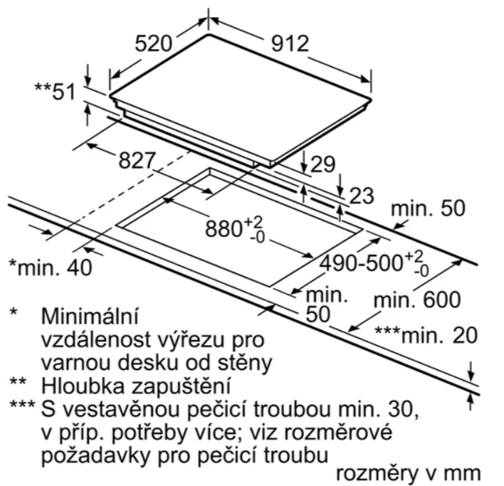 Rozměry a technické informace ● rozměry pro vestavbu: 880 mmx490 mm ● připojovací kabel (1,1 M)