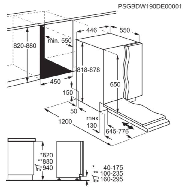 Vestavné rozměry V(min/max)xŠxH (mm): 820/900 x 450 x 550